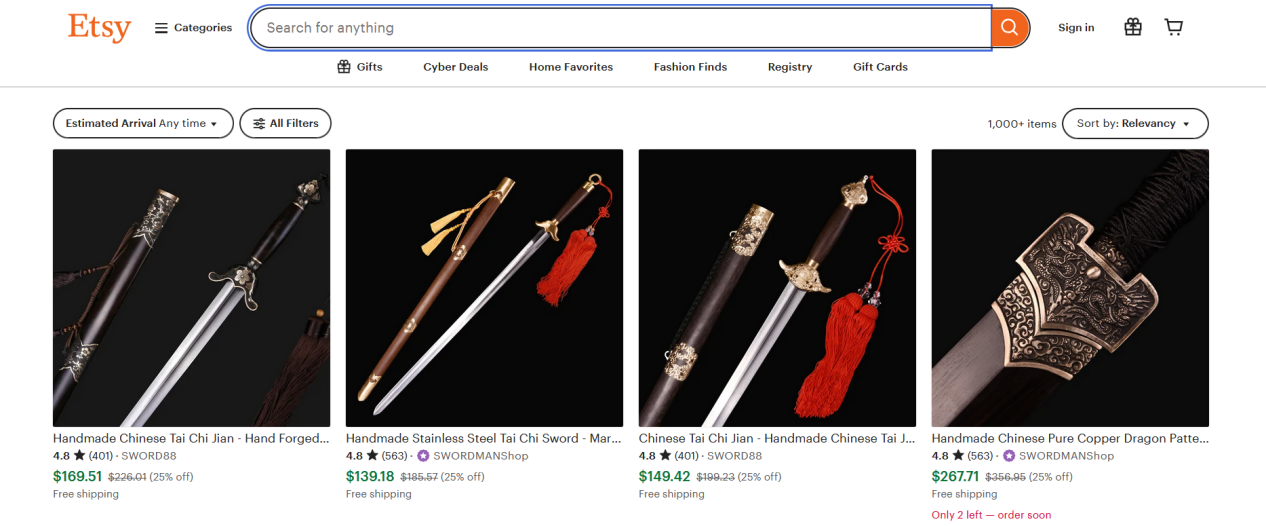 此外,若企业所在地有独特的资源,如特色农产品、手工艺品等,可将其进行优化加工后推向国际市场。如下图所示,在美国的电商网站Etsy上,来自中国的手工铁剑就非常受欢迎。对于身处产业集群地区的企业,可发挥优势,通过更便捷地获取原材料、零部件和专业技术支持,来高效地响应市场需求。