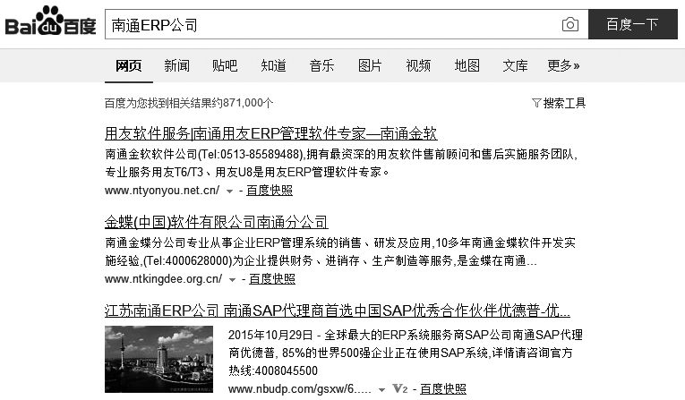 真正的原创文章,如一篇公司简介、一个产品介绍、一篇新闻报道等,由于是自然写成,能优化的关键词并不多。还有一类原创文章,虽然没有什么实质内容,但引流量效果明显,这类文章就是根据搜索词编写的文章。当客户搜索这类词时,该文章能排名在百度首页,通常都是按地区和按行业编写文章。如一家宁波ERP软件公司希望在南通开展业务,于是他们就写了一篇南通ERP公司的文章,尽管是宁波公司网站里的一个页面,但由于优化和推广做得好,排名效果不输南通当地的ERP公司,如图4-16所示,在百度搜索“南通ERP公司”的前三名。