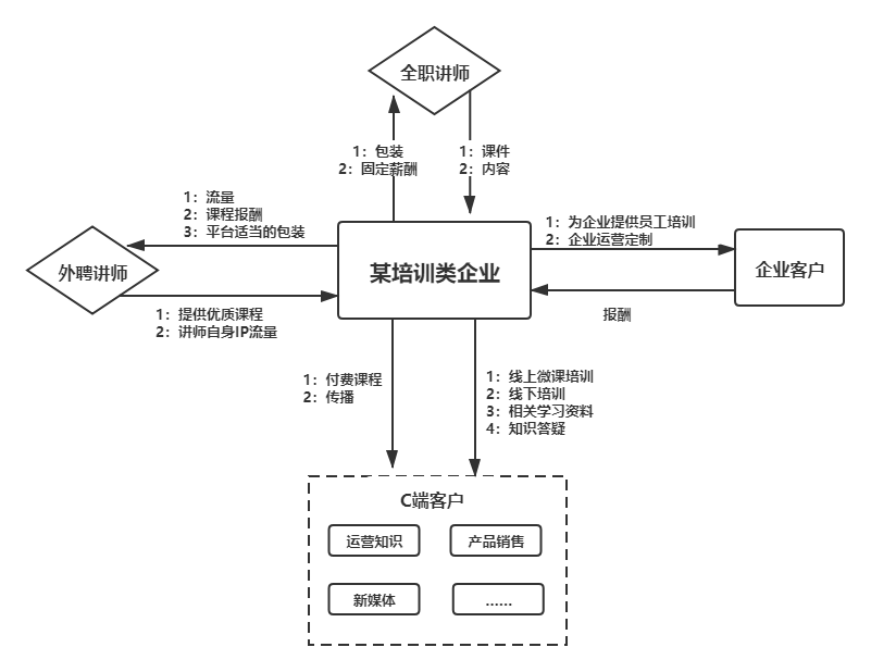 通过图3-1,我们可以很清楚地看到这家企业的整体交易结构,并且在这个结构可以判断出该企业的交易对象其实有4个,分别是内部讲师、外部讲师、服务企业及C端的客户。