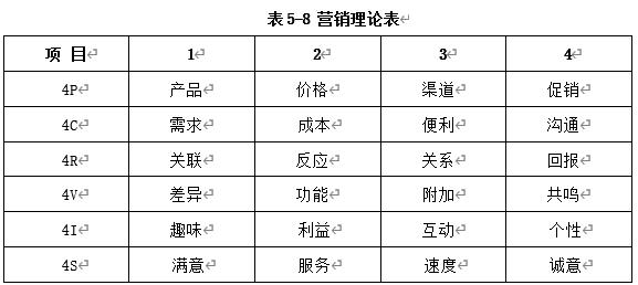 了解市场需求,抓住市场需求欲望,以最好的方案进行推广扩充,营造需求氛围,进行目标销售,达到广告效应、品牌效应,以树立品牌性格。在此,进行市场营销的人员必须略懂营销的6个基本理论(见表5-8)。