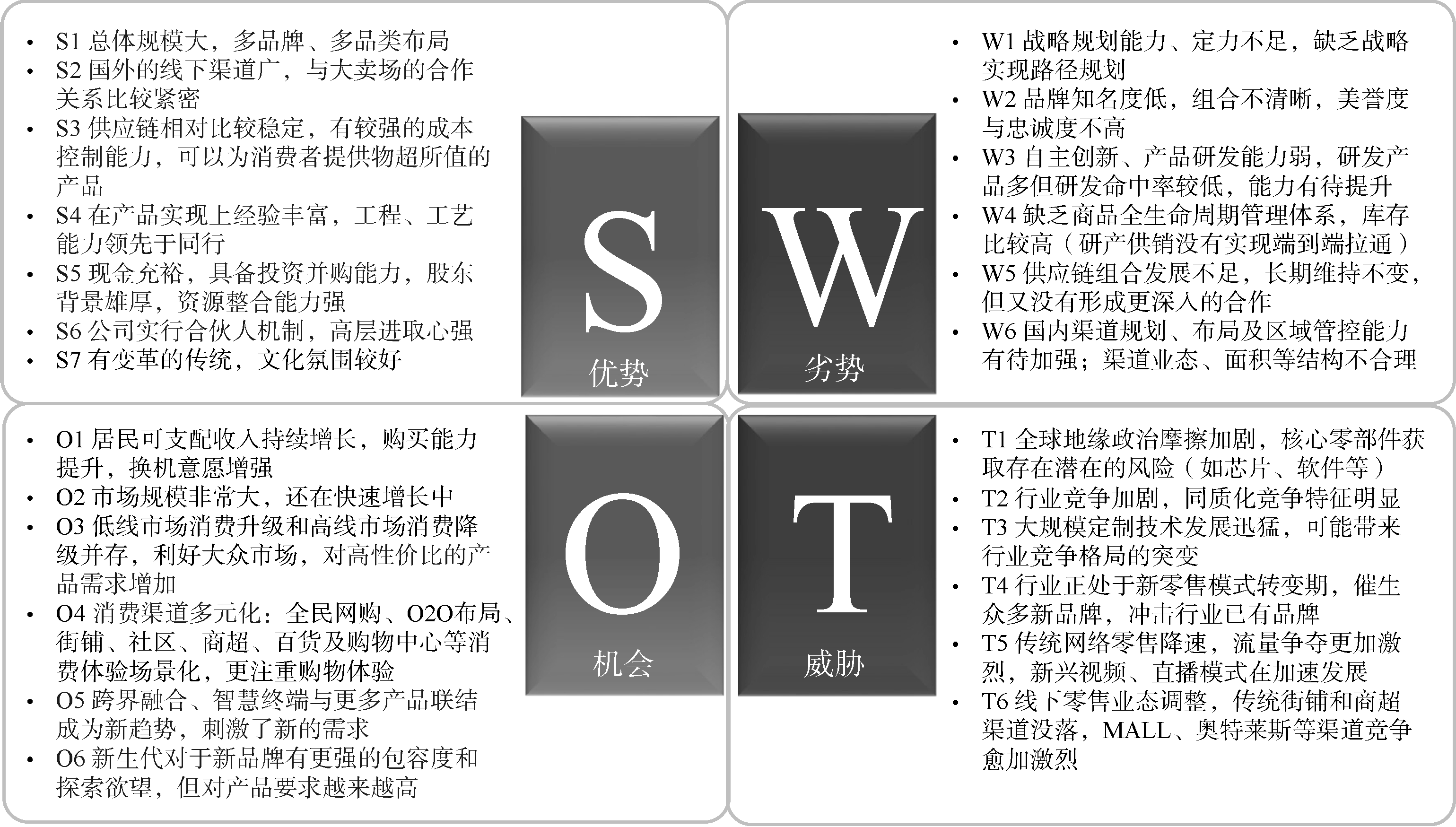 近年来,国内外经营环境发生了比较大的变化,尤其是在国内,随着智能终端的普及,消费者的购物习惯发生了很大的改变。洞察到这些变化后,公司有意改变经营模式,即从 B2B2C 模式转变为 B2C 模式。由于事关重大,公司战略管理部组织中高层和业务骨干进行了一次比较正式的战略研讨,对内外部环境做了分析,形成了一些共识,如图 2-3 所示。