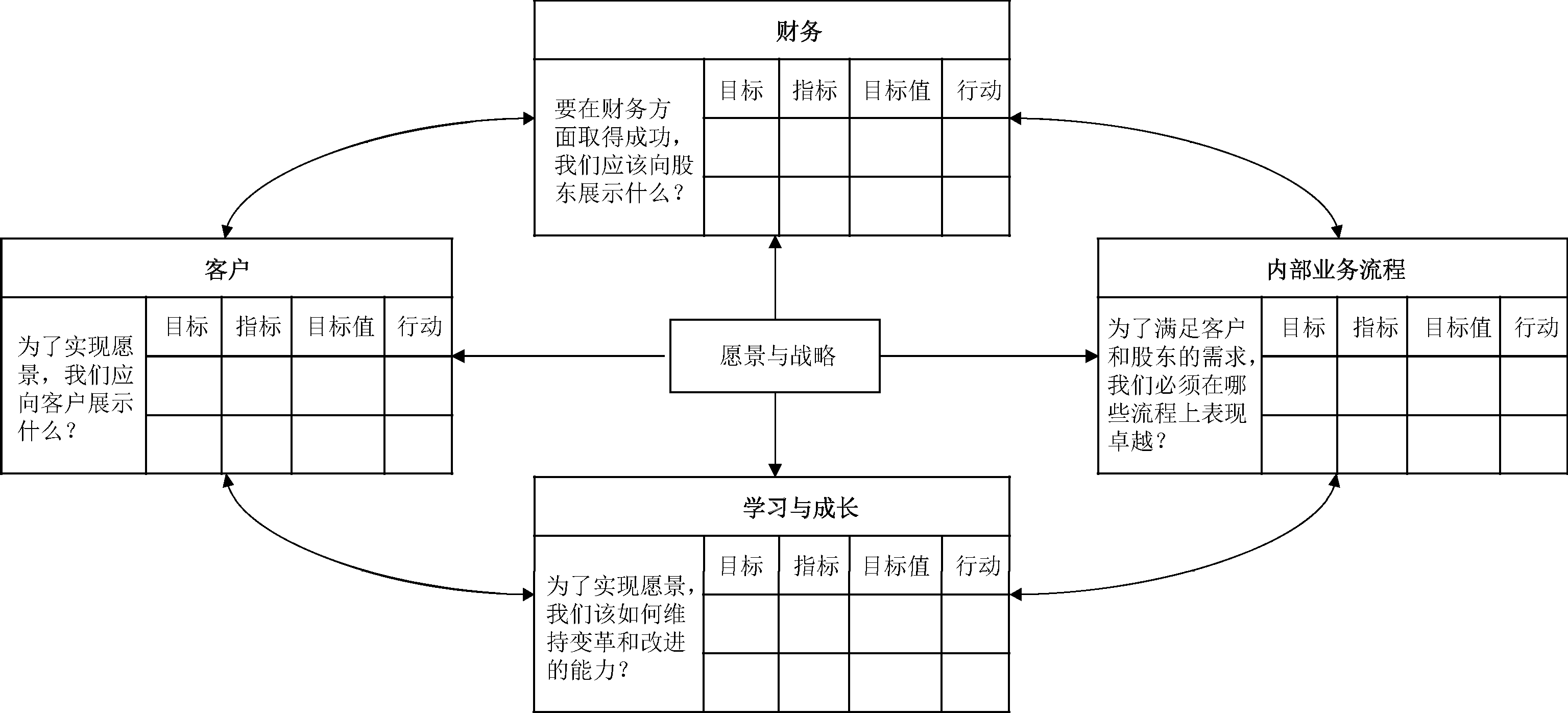 BSC 是由哈佛大学商学院教授罗伯特·S. 卡普兰(Robert S. Kaplan)和复兴方案公司的创始人兼总裁戴维·P. 诺顿(David P. Norton)在 1992 年 1—2 月号的《哈佛商业评论》上发表的一篇论文《平衡计分卡—驱动业绩的指标》中提出。它基于平衡的战略思想,从财务、客户、内部业务流程、学习与成长四个维度,将组织的战略落实为可操作的衡量指标和目标值的绩效管理体系,如图附 B-3 所示。