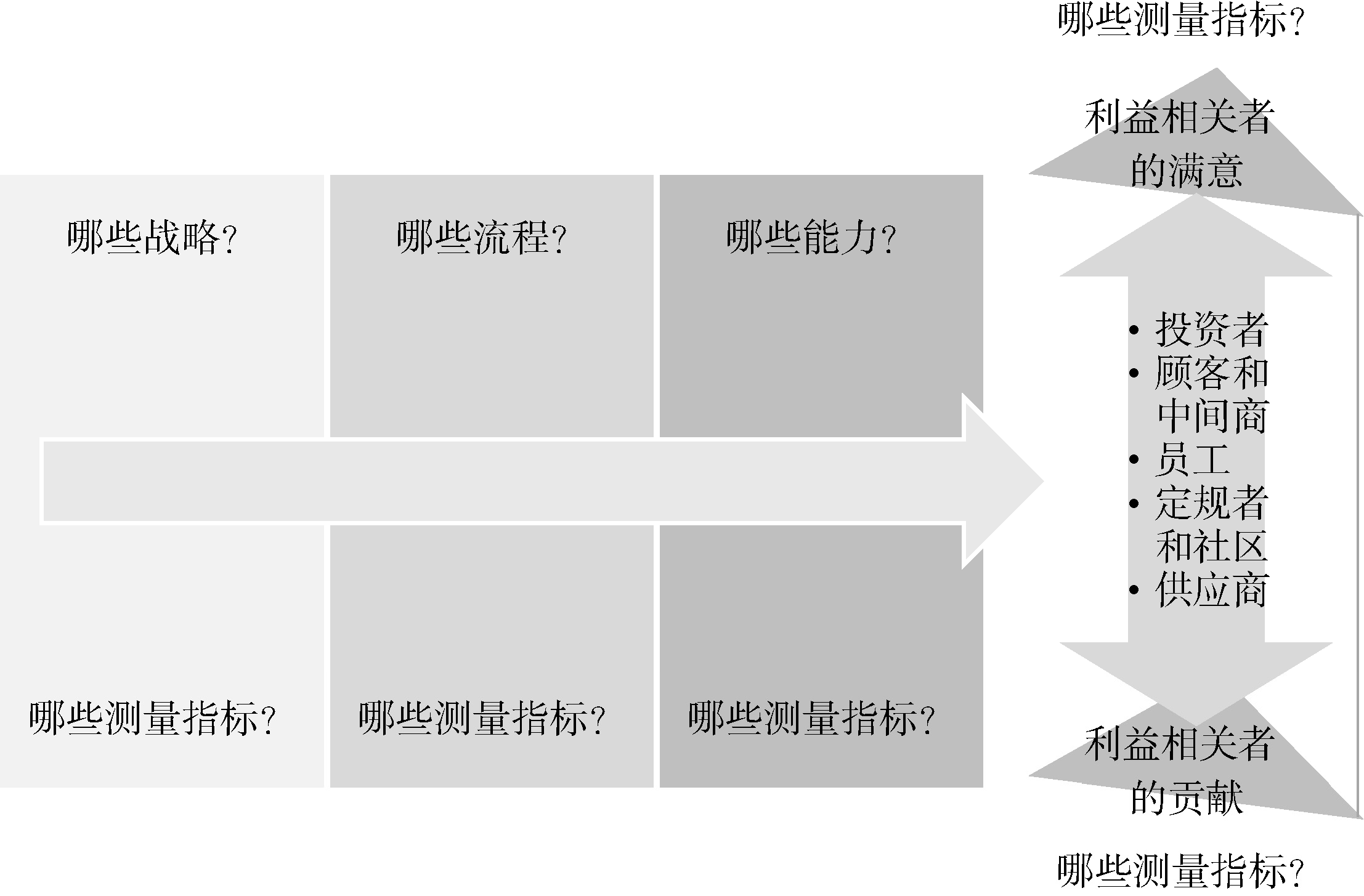 从图附 B-4 中可以知道,绩效棱柱模型有五个维度:利益相关者的满意、利益相关者的贡献、战略、流程和能力。其中,利益相关者的满意是核心,也是整个模型的基础,企业需通过战略规划、流程优化、能力建设,满足利益相关者的需求,以此来换取利益相关者的持续贡献。绩效棱柱模型的五个维度是相互关联的,需要作为一个整体来考虑,如图附 B-5 所示。