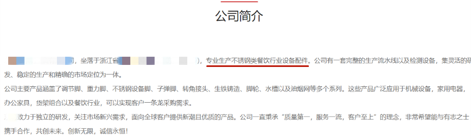 这家公司列出的产品列表里,只有“油烟过滤网”、“设备调平脚”、“设备脚轮”、“不锈钢水槽”、“不锈钢地漏”等等,似乎找不到逻辑关系;但查看公司简介,我们可以注意到这句关键的描述——“不锈钢类餐饮行业设备配件”。