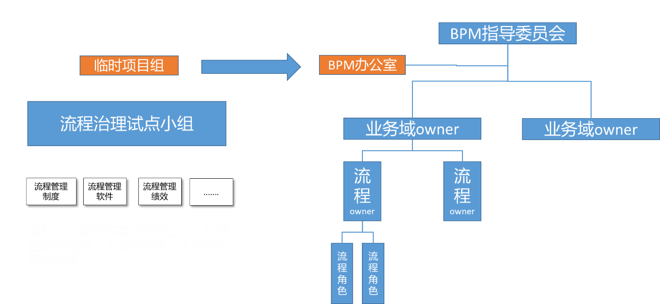 我们在第三步的时候成立流程治理试点小组,在经过一系列的流程治理措施,流程治理工作取得了一定效果后,可以考虑成立正式的流程治理组织。