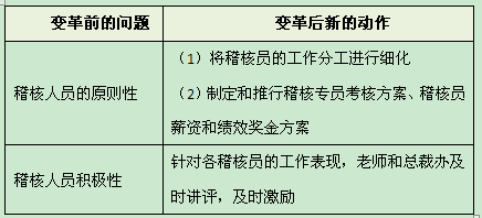 :针对稽核员工作积极性不高的问题,项目组推出的变革动作是:针对各稽核员的表现,老师和总裁办进行及时奖评,及时激励,如图5-10所示。