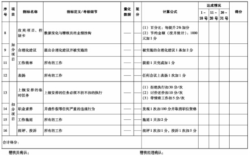 :第二,制定和推行《稽核专员考核方案》、《稽核员薪资和绩效奖金方案》。《稽核专员考核方案》如表5-9所示。