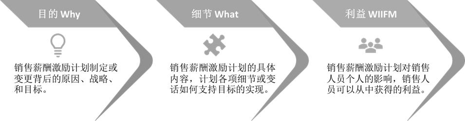 沟通策略包括沟通的目的、沟通传递的信息、沟通的频率、沟通的时间、沟通使用的媒体、工具和辅助资料、相关人员的职责和预期结果等。企业需要组建沟通团队,或专人负责制定有效的沟通策略。有效的销售薪酬激励计划沟通策略需要传递三个关键信息,也就是三个W,计划的目的Why、计划的细节What和计划带来的利益WIIFM。如图17-2所示。