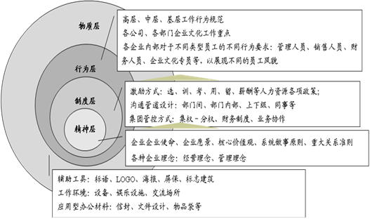 四是物质层面,对企业的办公环境、企业视觉设计、企业统一化标识等进行调整,以体现经营哲学。
