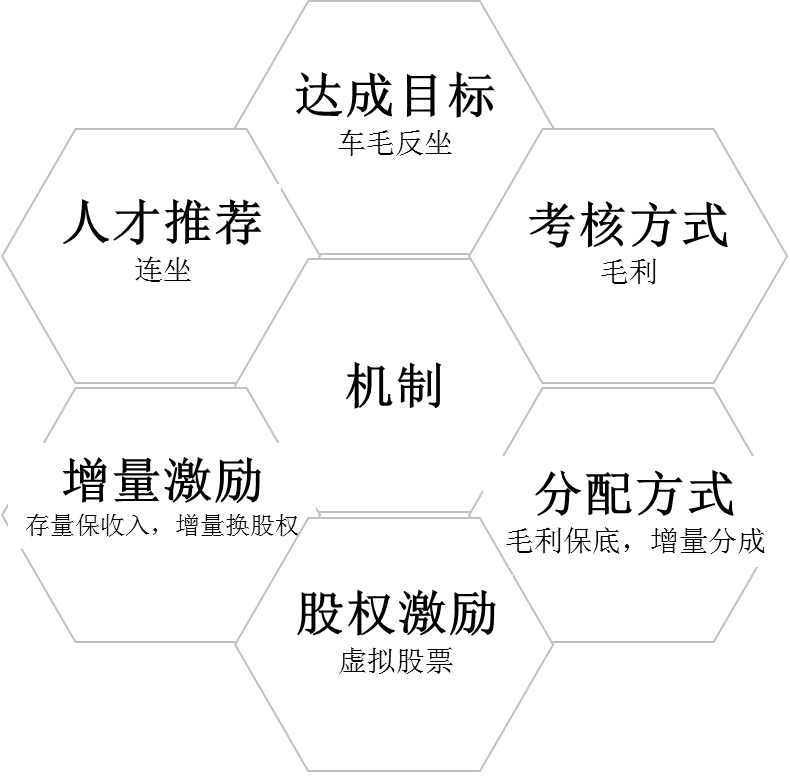 本土成功企业的共性都有灵活运用机制,共同创造,然后共同分享。传统的“工资+定额奖金”“底薪+业务提成”等激励模式在激活组织或者个人方面都渐渐显示出弊端。医药企业运用激励机制推动业绩增长的方法也越来越多,常见的如股权激励,既能留住能人,又能激励能人,让大家有归属感;合伙人机制,利益绑定,共创共享产品收益和股权收益;利润分成,在销售业绩超过设定目标,将增量部分的毛利全部分配给营销团队等。医药行业领先者已经开始探索精准激励,济民可信是用机制带动业务增长的典范。在销售任务上,设计了销售任务“梯度激励+车毛”反坐机制;人才推荐上实施“连坐”机制;考核方式上用毛利,净利考核;分配方式上实行毛利保底、增量分成;股权激励上使用虚拟股权激励;增量激励上,实施存量保收入,增量换股权。机制设计方法之丰富,值得业界同仁学习。济民可信的六大组织机制如图6-8所示。