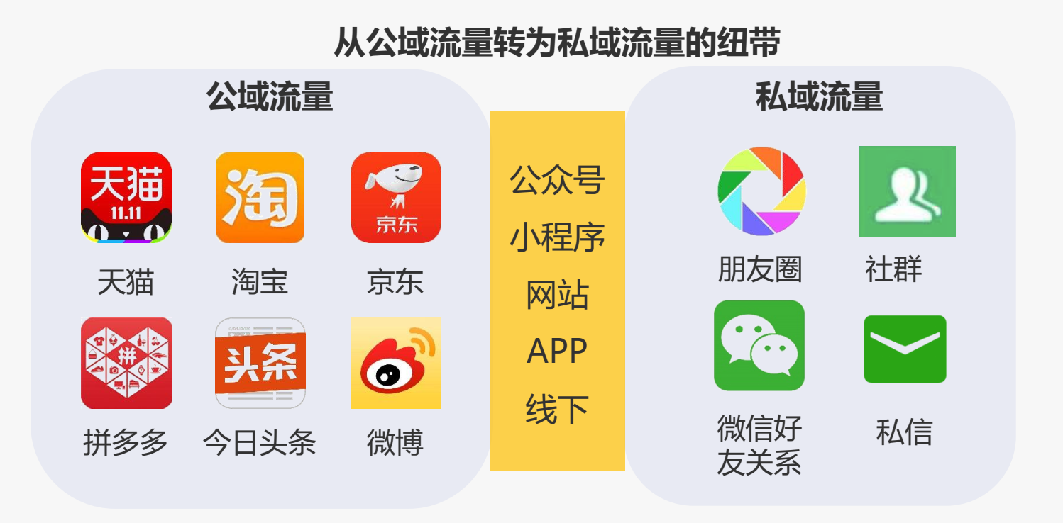 而“私域”就是“私人区域”,就是我的地盘我做主。“私城”的流量就是企业或个人自主拥有的、免费的、可以自由控制、多次利用的流量,就是成为不轻易走掉的用户。现在微信个人号、微信公众号、小程序、网站、App、线下店面是商家从“公域”流量转为“私域”流量的纽带,通过这些产品形态可将流量私有化,质量比较好,还容易运作。