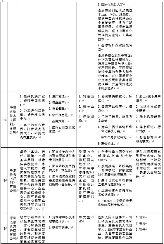 以深圳市为代表的大湾区管理咨询行业的各类企业基本上涵盖了上述管理咨询服务的范围,为充分展示大湾区管理咨询公司的风貌,我们根据管理咨询公司不同的服务产品、服务对象、服务模式以及企业的规模、历史、核心竞争力等因素,筛选出12家典型企业,同时加上具有代表性的典型咨询机构“上海天强管理咨询有限公司”和“北京和君集团有限公司”,对他们的业务范围与专业能力等概况进行介绍。