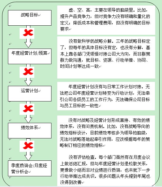 “根据前期调研,虽然公司每个月都会开经营分析会,但各部门汇报的形式和内容基本上没做要求,每个部门只是简单地汇报一下上个月做了什么、下个月的计划,汇报的内容未必是年度计划承诺的工作。目前,公司也没有与客户服务相关的考核指标,中高层管理人员的考核是由你凭感觉直接打分。”我说。